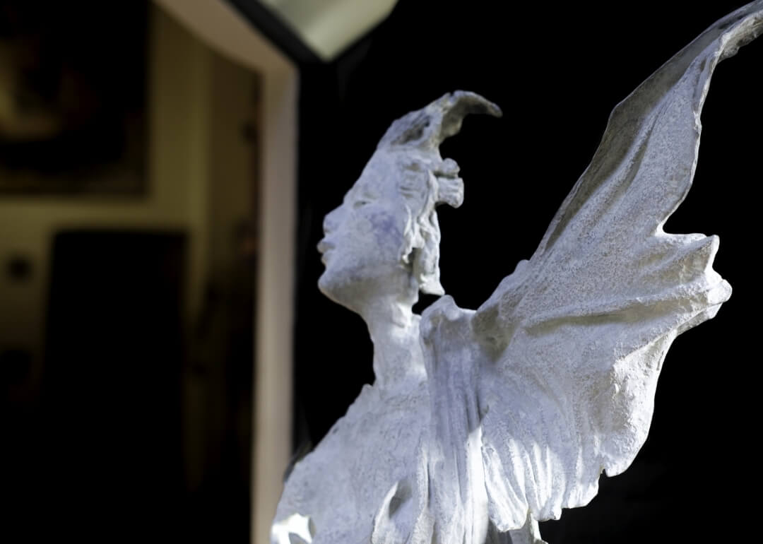 The curatorial concept behind this exhibition of Romolo Del Deo at Il Bottaccio is to explore the main body of his work that bestows wings in various unconventional ways such as to mythological figures that don’t usually get depicted as winged, like Daphne, in the “Tree of Life Which Is Ours;” to ideas and invented mythological figures like “Sovra;” in fantastic reality where wings aren’t normally depicted, such as sprouting from feet and faces, like in “Mercurio;” or to mortals who assumed wings like “Daedalus.” Frequently the artist makes it apparent that the wings are an assumed identity or a transformed identity.