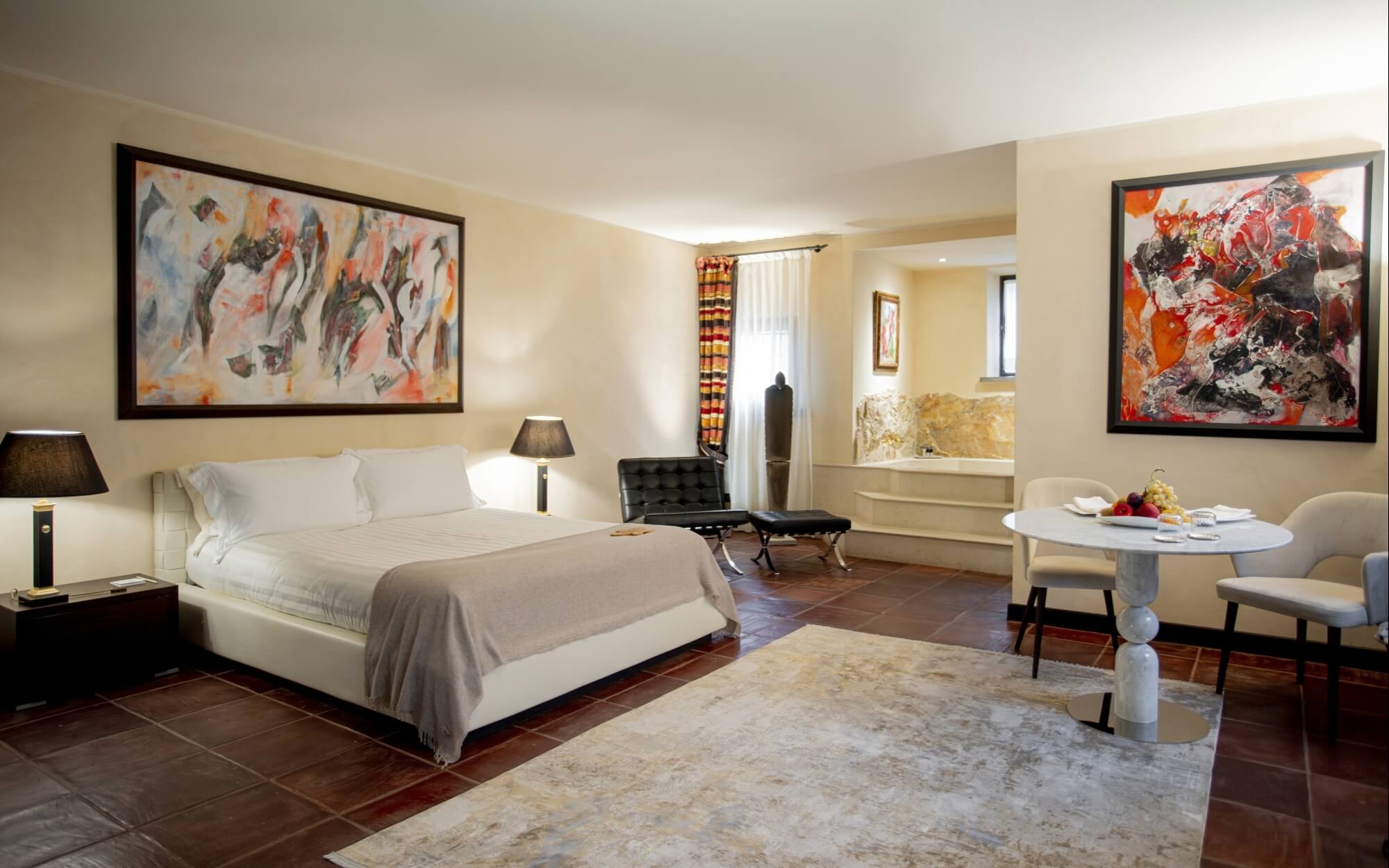 La Junior Suite ‘Torretta’ vi accoglie con un’atmosfera seducente esaltata dalla vasca in camera in travertino ed inserita nelle pareti dell’antica torre. Qui tutto è studiato per favorire il riposo ed il relax. I riflessi dei tessuti dai toni caldi sull’acqua donano una piacevole sensazione di calma e tranquillità.